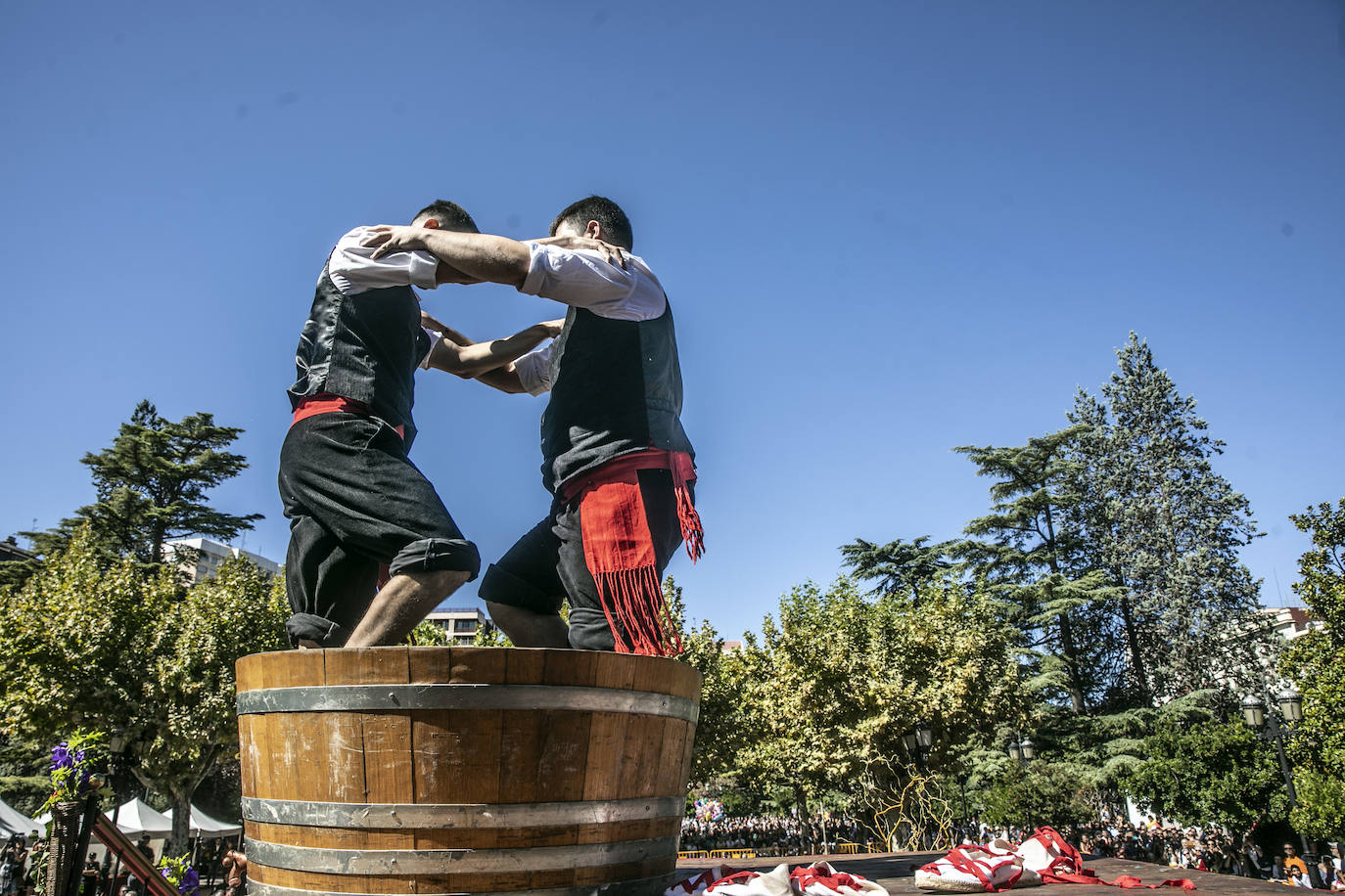 Cestos de racimos de uva de todas las comarcas riojanas son traídos por parejas de niños vestidos con los trajes típicos comarcales y se vierten a una tina donde serán pisados según la manera tradicional: dos hombres vestidos con el traje regional, la familia Urdiales (actualmente los nietos de los primitivos), descalzos y uniendo sus brazos van dando vueltas dentro de la tina, en una especie de baile ancestral, donde se han depositado los racimos de uva.